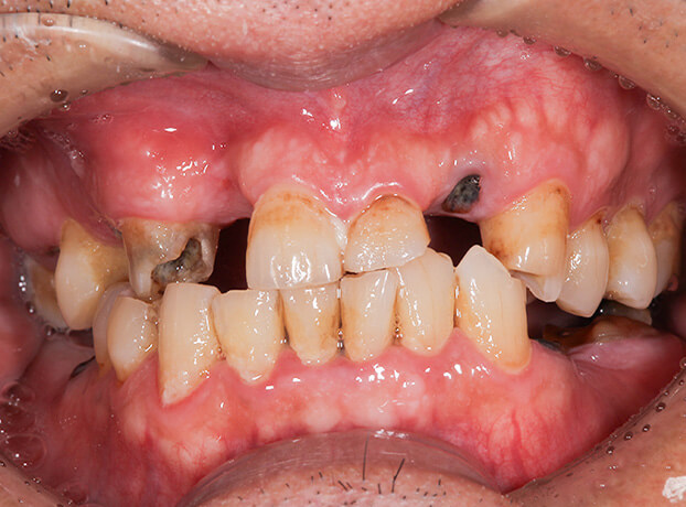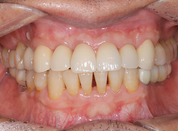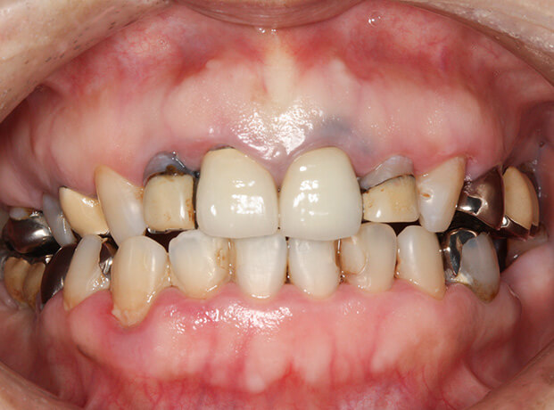 ボロボロの歯を総合的に治療したケース。虫歯と歯周病の進行を止め、抜けている部分はインプラント治療をしたケース。