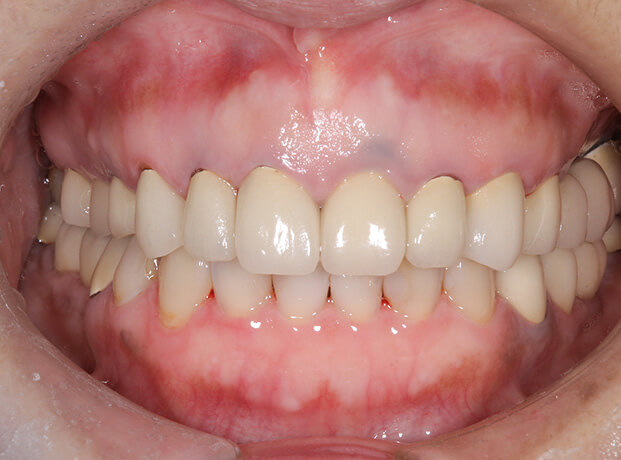 保険治療の繰り返しで審美性に問題があったケース。インプラントやセラミック治療でキレイに改善。